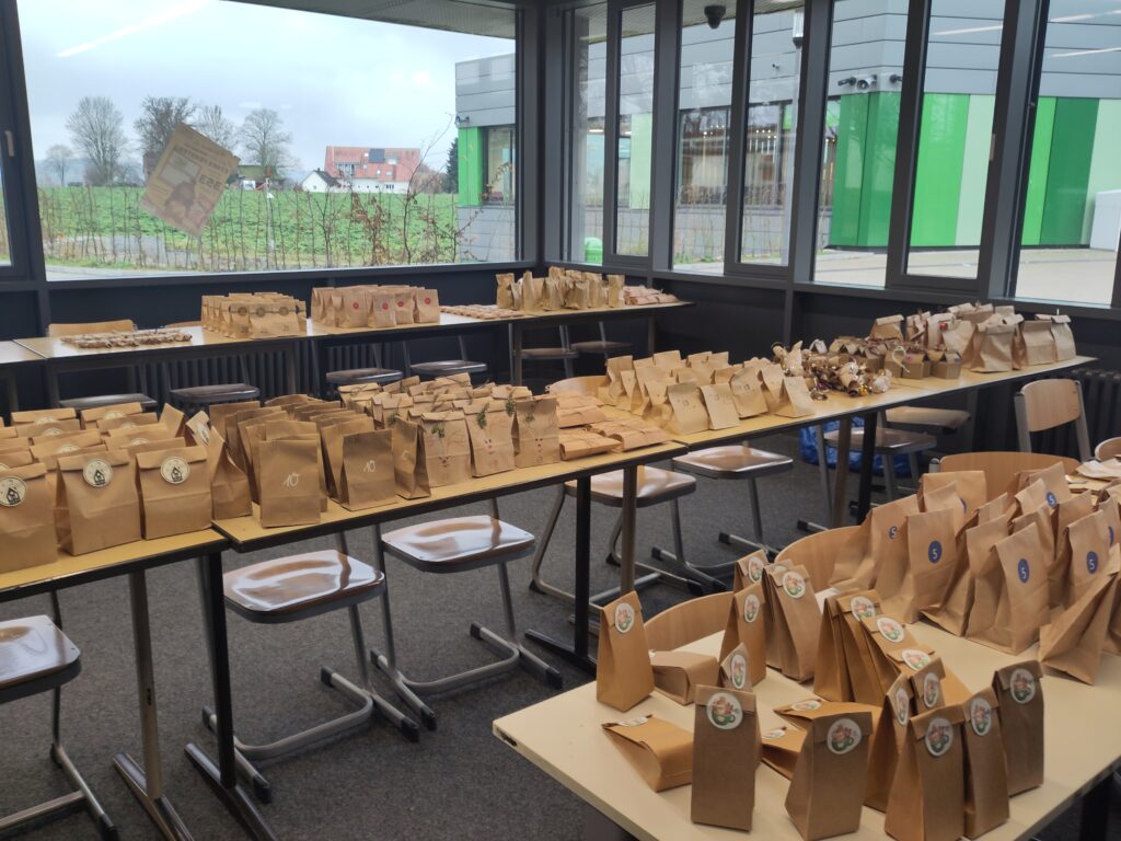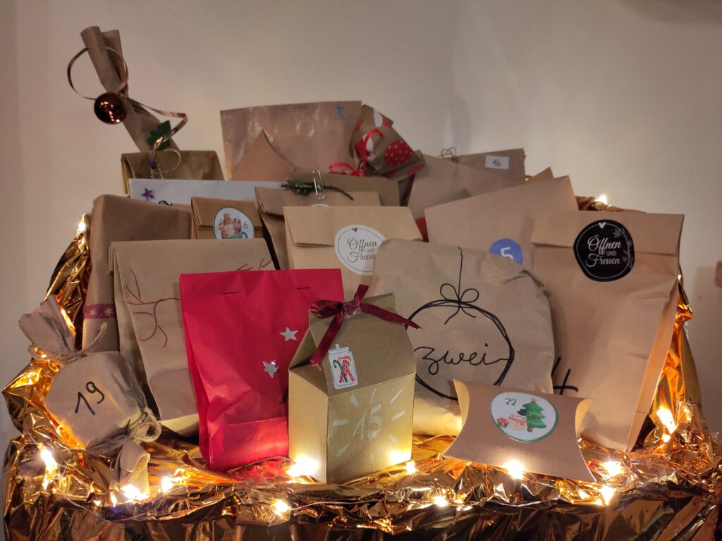Jede Teilnehmende gestaltete ein „Türchen“ des Adventskalenders, nur gleich 21 Mal. So sind zwei Adventskalender voller liebevoll gestalteter Päckchen entstanden, die am Tag der offenen Tür am 22.11.25 verlost werden. Der Erlös der Verlosung (ein Los kostet 2€, drei Lose kosten 5€) wird komplett an das Kinder- und Jugendhospiz in Bethel gespendet, damit auch dort das eine oder andere Lächeln ins Gesicht gezaubert werden kann!
