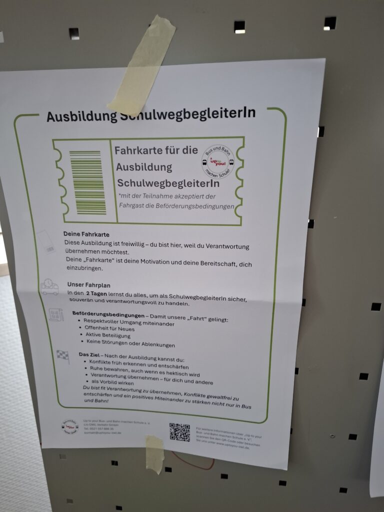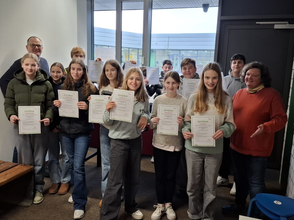 Unter Federführung von Frau Sandra Krasemann, Mitarbeiterin des Vereins „up to you“! Bus&Bahn machen Schule“ e.V. aus Bielefeld sind Anfang Oktober dieses Schuljahres insgesamt vierzehn Schülerinnen und Schüler des 8. Jahrgangs zu Schulwegbegleiterinnen und Schulwegbegleitern geschult worden. Am Freitag, 28. November 2025 wurde nun nach der zweitägigen Schulung ein Zertifikat im Beisein von Herrn Friebertshäuser, Frau Rave, Frau Krasemann und Herrn Schumacher verliehen. Darüber hinaus erhielten Sie einen Ausweis und einen Anhänger für Ihren Ranzen bzw. Rucksack. Somit können die Schülerinnen und Schüler an den Bushaltestellen erkennen, welche Jugendlichen Ansprechpartner und Vermittler an Haltestellen und während der Fahrt sind.