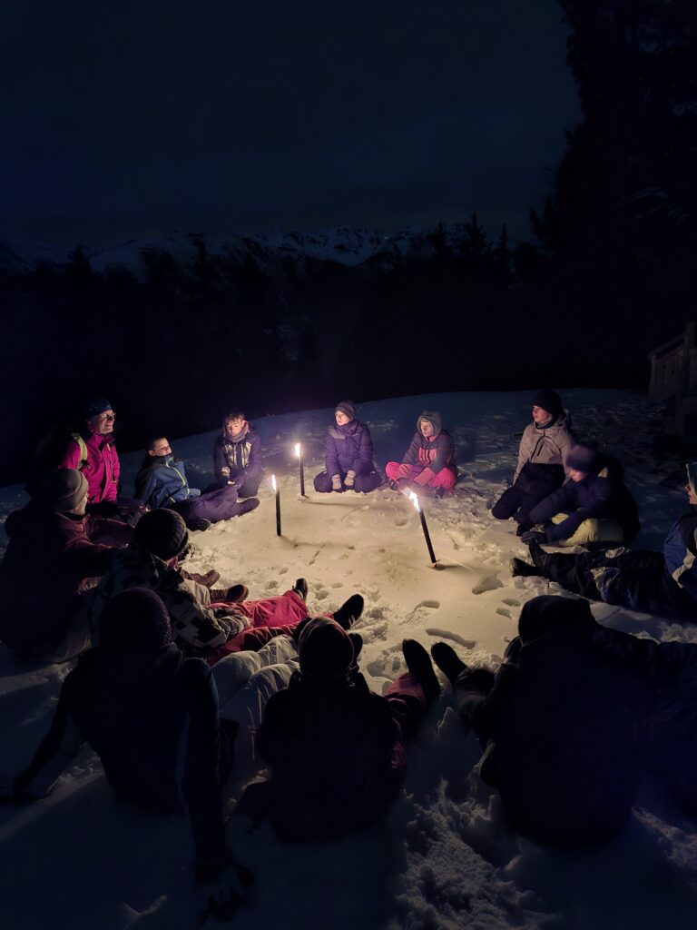 Mittwoch war ein guter Tag. Wir sind alle die blaue Piste gefahren und ein paar von uns sogar schon die rote Piste. Abends machten wir eine Nachtwanderung auf den Berg mit Fackeln und lasen unsere selbst geschriebenen Gedichte über unsere Ski-Woche. Die lasen wir laut über die Berge hinweg, danach 2 Minuten Stille.