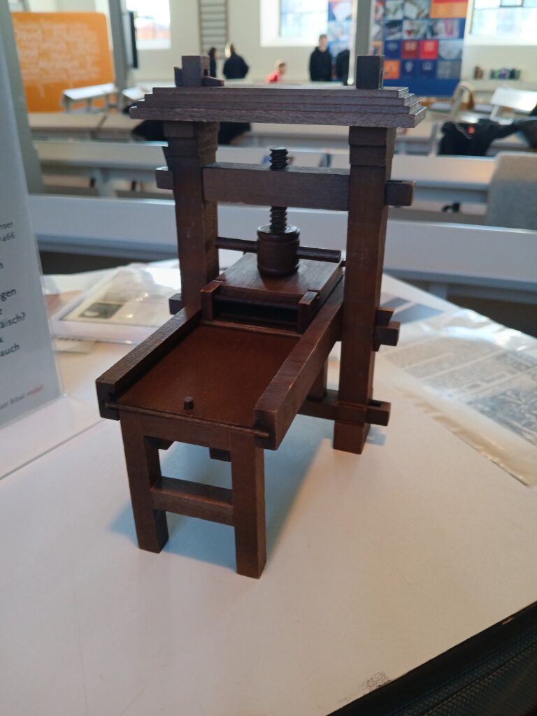 Die kleinste Bibel liegt auf einem kleinen Chip unter einem Mikroskop, da man sie nur unter der Lupe des Mikroskops erkennen kann. Mein Lieblingsstück ist ein Model der Druckerpresse, mit der eine Seite eingespannt bedruckt werden konnte. So konnte man die aufwendige Arbeit mit Feder und Pergament vermeiden. (Jonathan)