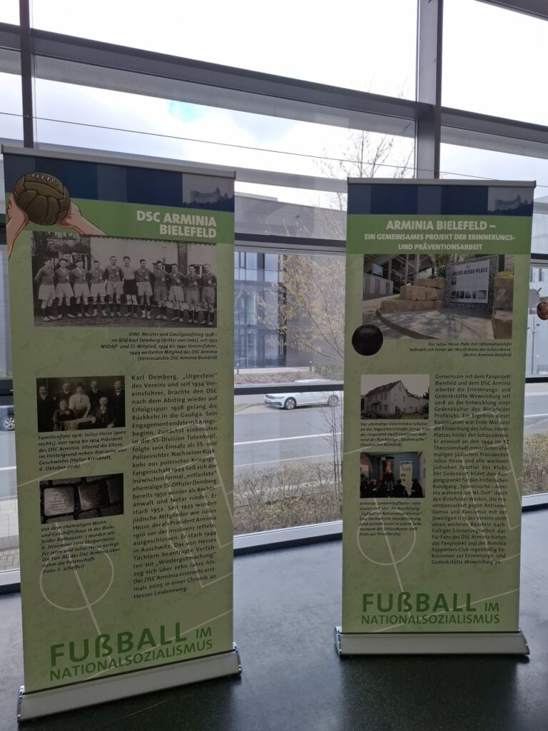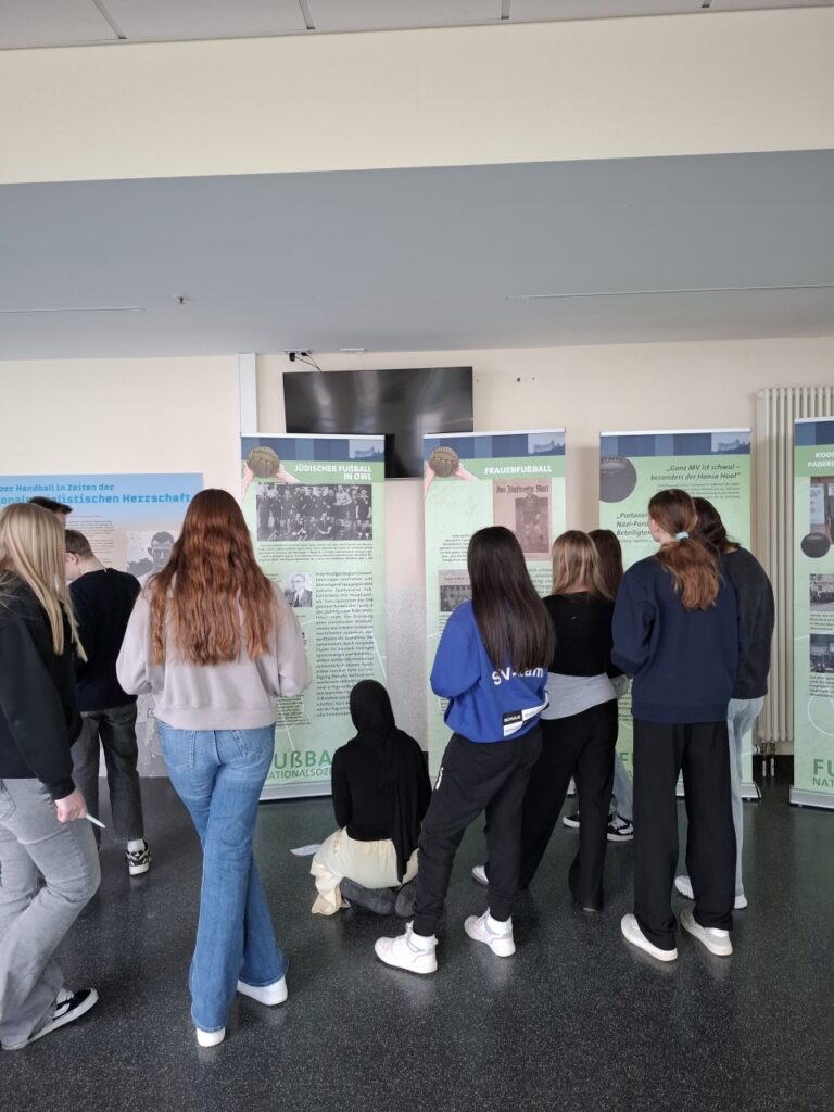 Am Mittwoch den 25.03.2026 haben wir die Klasse 9.1 einen Unterrichtsgang zum Fach Sport/Gesellschaftslehre unternommen. Es ging um das Thema „Fußball zur NS-Zeit“. Die Wanderausstellung von der Wewelsburg wurde nach Lemgo ausgeliehen. Zuerst trafen wir uns mit der Klasse um 08.05 Uhr am Bahnhof Oerlinghausen. Von dort aus ging es mit dem Zug direkt zur „Phoenix-Contact-Arena“ vom TBV Lemgo, in der sich die Wanderausstellung befand. An der Arens angekommen führte uns eine nette Frau vom Kreis Lippe zu dem Platz wo wir unsere Sachen ablegen sollten und später auch frühstücken sollten. Anschließend ging es in den Ausstellungsraum. Hier standen mehrere Banner und Schilder, die mit Schrift und Bildern über die damalige Zeit berichteten. (Phil)