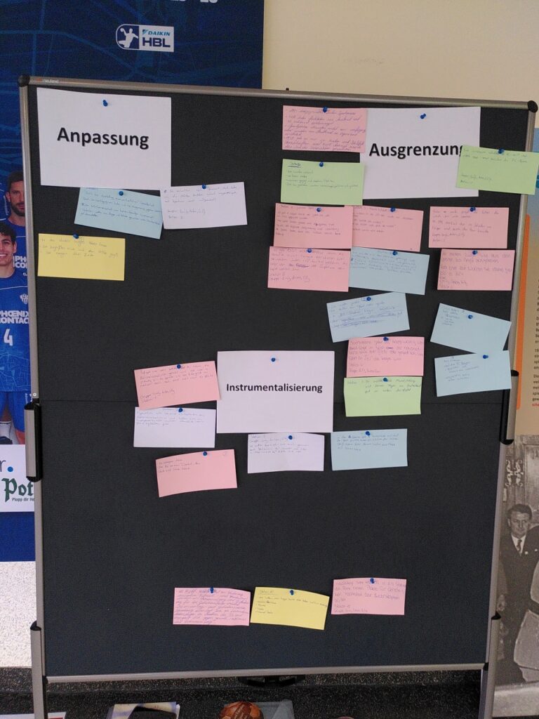 Als wir damit fertig waren, setzten wir uns wieder im Kreis zusammen und stellten der Reihenfolge nach von Station 1 bis 10 unsere Ergebnisse vor und mussten entscheiden, ob wir sie zu „Anpassung“, „Ausgrenzung“ oder „Instrumentalisierung“ sortiert anpinnen und begründen, weshalb wir uns für die Zuordnung entschieden haben. Als schließlich alle vorgestellt hatten, bekamen wir die Frage gestellt was Fairplay und Respekt eigentlich bedeutet und was das mit Politik zu tun hat. (Masume)